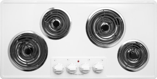 Electric Cooktop with Ready-Select Controls and Color-Coordinated Control KnobsThe Frigidaire 36" electric cooktop is very versatile, durable and extremely efficient. Cooktop features chrome drip bowls that make cleaning up spills quick and easy.Features:Ready-Select Controls - Select options or control cooking temperature with the easy to use controlsColor-Coordinated Control Knobs - White, Black and Bisque cooktops come with matching knobs - while Stainless Steel models feature the neutral black knobsSpillSafe Drip Bowls - Cooktop features chrome drip bowls that make cleaning up spills quick and easyADA Compliant Specifications:A.D.A. Compliant: YesAgency Approval: ULControl Location: Center frontCooking Surface: Color-Coordinated PorcelainRight Front: 6" - 1,250 WattsRight Rear: 8" - 2,100 WattsLeft Front: 8" - 2,100 WattsLeft Rear: 6" - 1,250 WattsKnob Type: PlasticBowl Type: ChromeHeight: 3-7/8"Width: 36"Depth: 18"Power Supply Connection Location: Front MiddleVoltage Rating: 240V / 208V, 60HzConnected Load (kW Rating) @ 240V: 6.7 / 5.0Frigidaire is the brand you have come to know and trust. And for good reason. Year after year, Frigidaire has been the most reliable brand among leading appliance brands with the lowest number of service calls. With Frigidaire, you can be sure you'll receive effortless features and quality materials, giving you the highest quality performance for the life of your appliances.